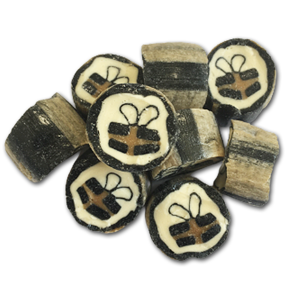 De fineste julegaver med smag af de velkendte sort bismarck bolsjer. En lækker kombination af lakrids, mint og menthol