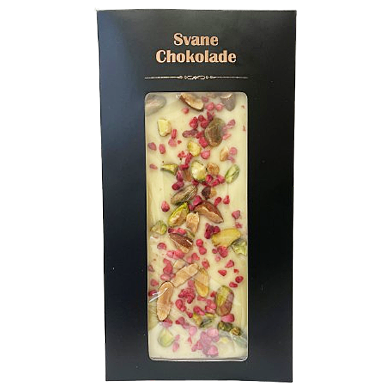 | Ingredienser | Hvid chokolade (Sukker, kakaosmør, sødMÆLKspulver, emulgator: SOJAlechitin, naturlig vanilje aroma), MANDEL; ristet, PISTACIE; ristet, frysetørret hindbær |