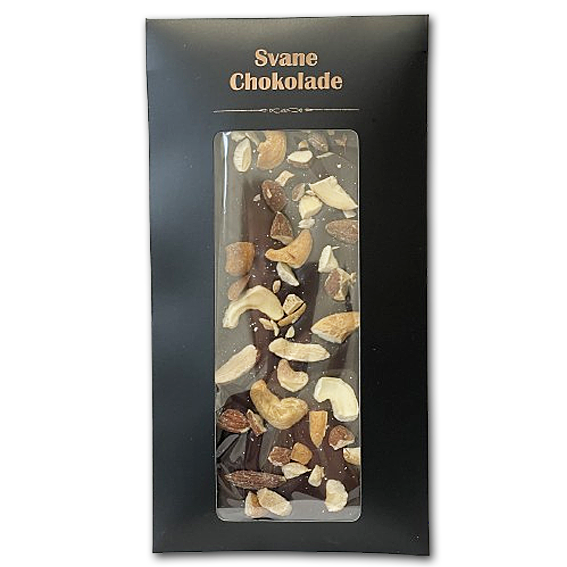 | Ingredienser | Mørk chokolade (kakaomasse, sukker, kakaosmør, emulgator: SOJAlechitin, naturlig vaniljearoma) Ristede MANDLER, ristede CASHEWNØDDER |