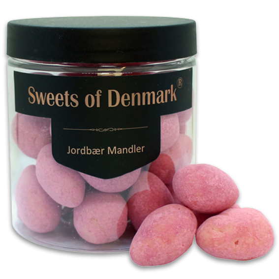 Mandler overtrukket med dejlig sød, hvid chokolade og rullet i jordbærpulver.