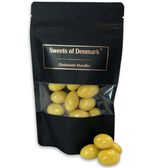 Mandler overtrukket med hvid chokolade og et tyndt sukkerlag med forfriskende passionsfrugt.