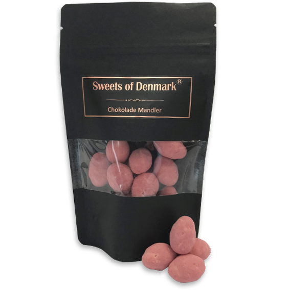 Mandler med lækker sød, hvid chokolade og rullet i let syrlig jordbærpulver. En superskøn kombination.