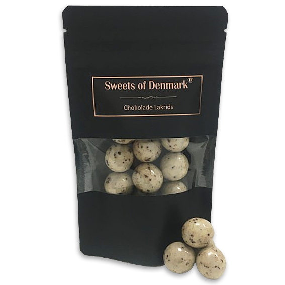 Sød lakrids overtrukket med hvid chokolade og mælkechokolade med dejlig smag af kaffe i flot indpakning