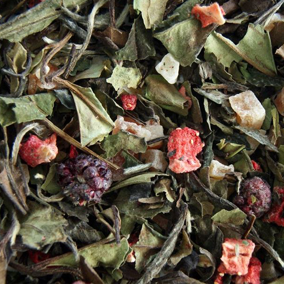 Indhold: Hvid pai mu tan te, kandiserede papayastykker, kandiserede ananasstykker, frysetørrede jordbærstykker, frysetørrede brombær, aroma