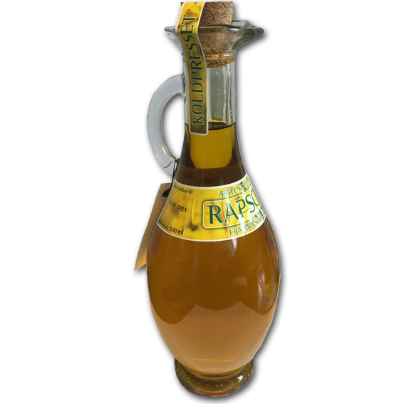 Denne ægte koldpressede rapsolie er tyktflydende og drøj i brug, den har en behagelig smag og duft samt en flot gylden farve