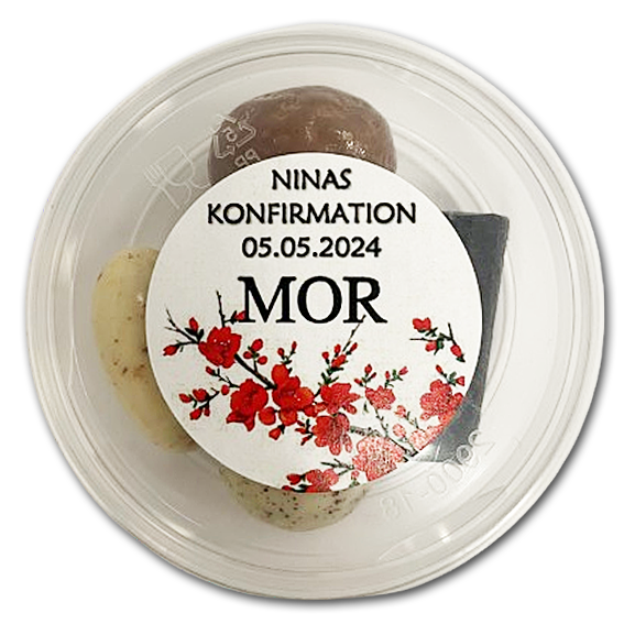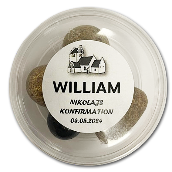 *50 ml bøtter, Ø 65 mm, indeholder 5 stykker slik hver. Etiketterne måler 40 mm i diameter.