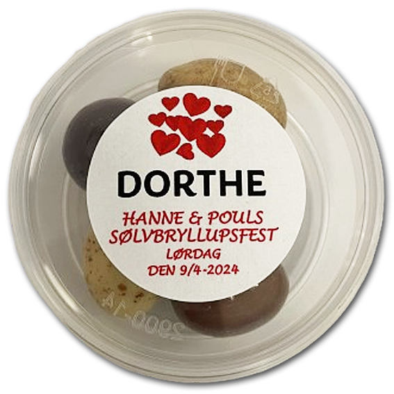 Du kan vedhæfte et billede, du gerne vil have på etiketten, samt oplyse navnene på gæsterne. Vi laver et designforslag og sender det til dig til godkendelse, inden vi færdiggør og sender ordren.