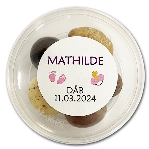 *50 ml bøtter, Ø 65 mm, med 5 stykker slik i hver. Etiketterne måler 40 mm i diameter.