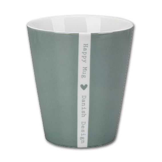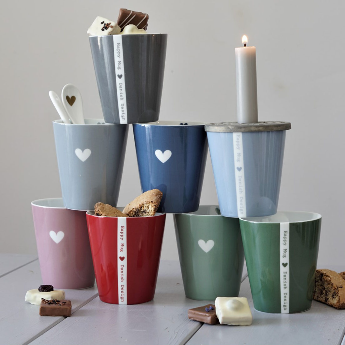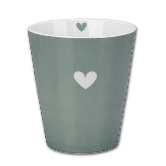 Krus i porcelæn i en flot grøn farve dekoreret med et hjerte. Kan bruges til alle varme og kolde drikke eller som lysestage