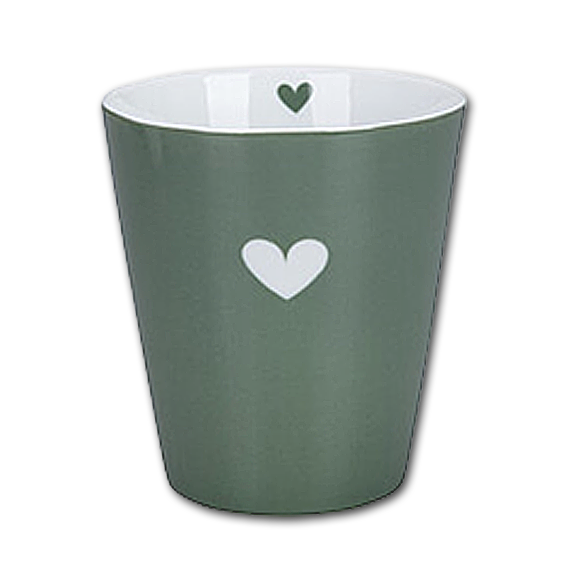 Krus i porcelæn i en flot farve dekoreret med et hjerte. Kan bruges til alle varme og kolde drikke eller som lysestage