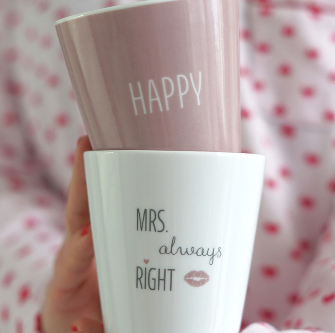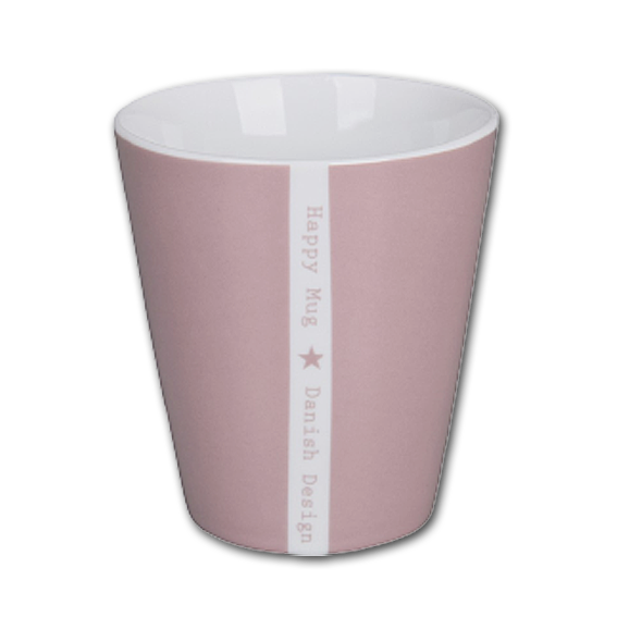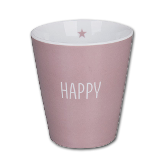 Krus i porcelæn i flot design med teksten Happy. Kruset er velegnet til kolde og varme drikke.