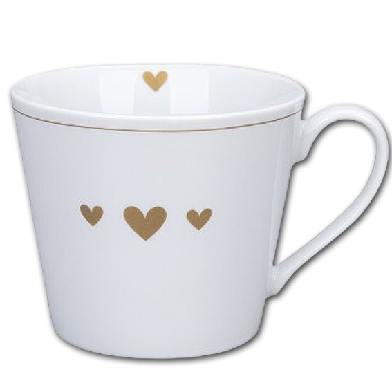 Sød kop til at nyde din kaffe, te eller kakao i. Den er flot dekoreret med guldhjerter både udenpå og indeni.