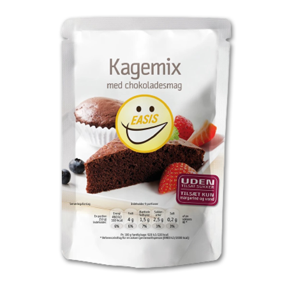Easis kagemix med chokoladesmag er uden tilsat sukker og giver en dejlig luftig og lækker kage og så er den nem at mixe sammen hvis du bliver lækkersulten. Den indeholder desuden 53% mindre fedt og 46% færre kalorier end en traditionel chokoladekage.
