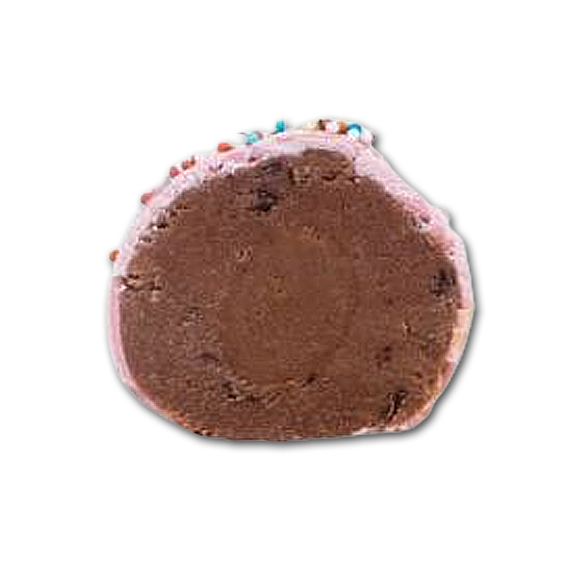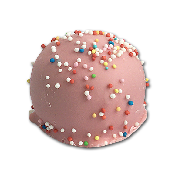 En sød og lækker jordbær trøffel fyldt med flydende saltkaramel, overtrukket med jordbær chokolade og drysset med tivoli krymmel.