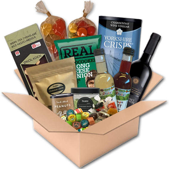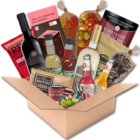 Vælg mellem en kasse med én flaske vin og to saft/sodavand til 350 kr med indhold til en værdi af minimum 420 kr eller en kasse med to flasker vin og fire saft/sodavand til 500 kr med indhold til en værdi af minimum 600 kr.