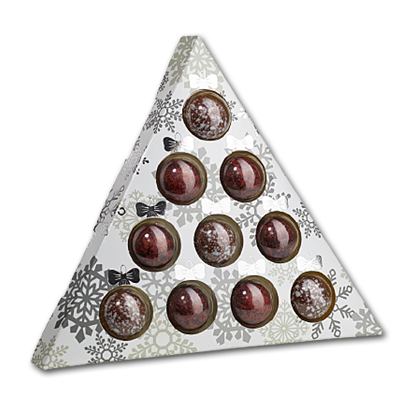 Flot trekantet æske med julemotiv indeholdende ti stykker lækker fyldt chokolade