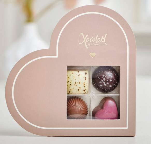 Den smukt udformede hjerteæske indeholder nøje udvalgte chokolader fra Xocolatl, der hver især er fyldt med delikate smagskombinationer. Fyldte chokolader er kendt for deres kvalitetsingredienser og fine håndværk, og med Xocolatl får du en udsøgt oplevelse med hver bid.