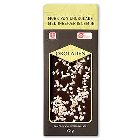 Skøn økologisk 72% mørk chokolade der her er kombineret med dejlig ingefær som med sin kraftige smag går rigtig godt med den mørke chokolade. Til at gøre det til en helt fantastisk smagsoplevelse er der tilsat lemon.
