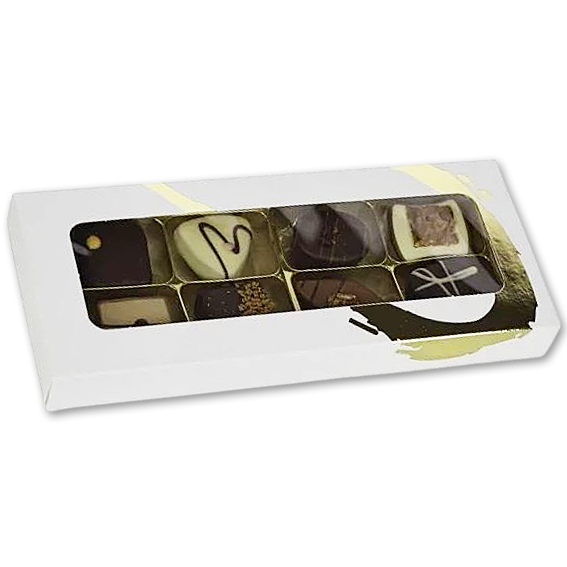 Chokoladeæske fuld af lækre fyldte chokolader med både hvid, mørk og lys chokolade. Giv den som gave til en du holder af
