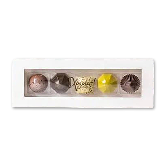 5 fyldte chokoladehjerter med med kokos, mint, saltkaramel, lakrids og citron i en sød æske med rude