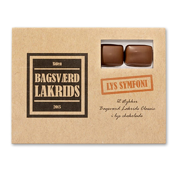 Her får du en æske med 12 stykker af det lækre lakrids fra Bagsværd som er overtrukket med lys chokolade. Det er håndlavet dansk kvalitet.