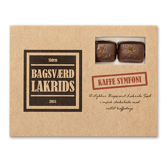 En skøn æske med sød Bagsværd Lakrids udskåret, overtrukket med mørk chokolade og pyntet med ristede kaffebønner