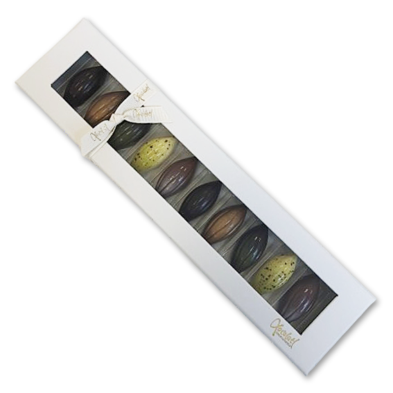 Eksklusiv gaveæske med elegante og delikate gourmetchokolader, perfekt til at forkæle dig selv eller som en gave. De smukke fyldte chokolader er formet som kakaobønner og med forskellig lækker fyld som sætter tænderne i vand.