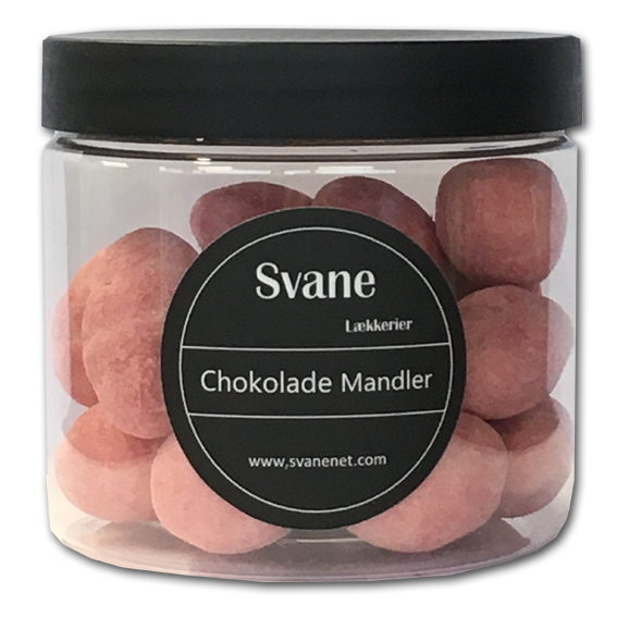 Mandler overtrukket med hvid chokolade og rullet i jordbærpulver. Det giver en virkelig dejlig smag