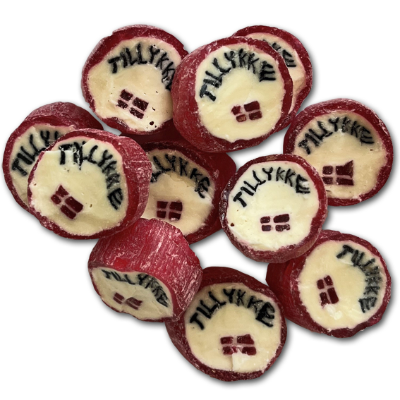 Fine røde og hvide bolsjer med teksten TILLYKKE. Sammen med vores Danske Flag bolsjer kan det da ikke blive mere festligt :)