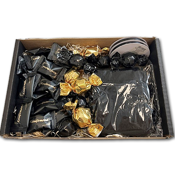 Konfirmationspakken består af 60 bolsjer, 20 chokoballs, 20 organzaposer samt 2 ruller satinbånd. Alle elementer er nøje udvalgt i sorte nuancer, som giver bordet et eksklusivt og gennemført udtryk. Indholdet leveres samlet i en æske, så det er nemt at gå til og let at fordele.