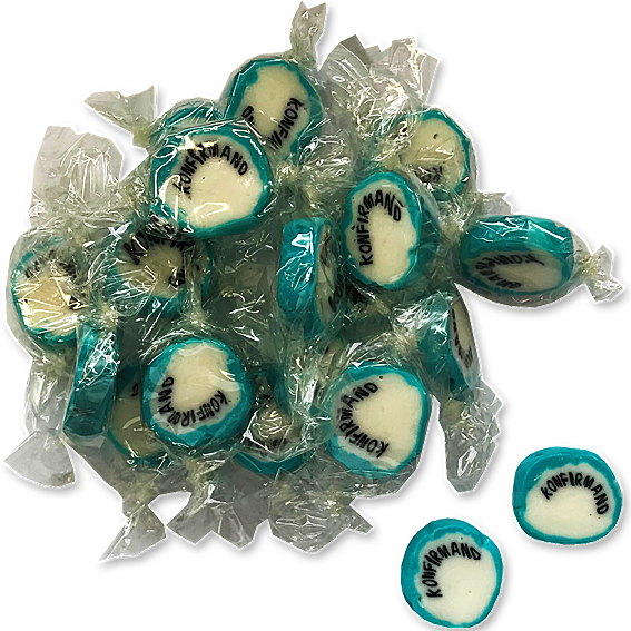 ENKELTVIS INDPAKKEDE bolsjer til konfirmanden med en dejlig smag af blåbær. Lækre håndlavede kvalitetsbolsjer som er særdeles velegnede som f.eks. bordpynt