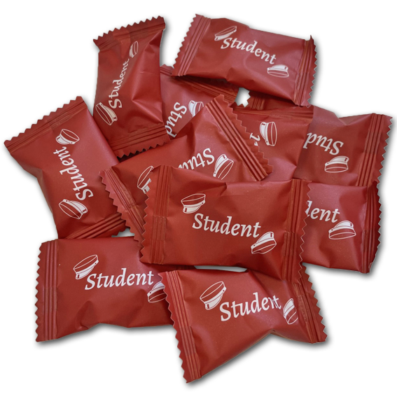 Et bolsje i en lille, elegant flowpakket pose med teksten Student er en fin detalje til at fejre en helt særlig dag. De enkeltindpakkede bolsjer egner sig godt som borddekoration, en lille gave til gæsterne eller som en del af en personlig goodiebag til studenterfesten. Med den klare Student-tekst bliver bolsjerne en hyggelig og mindeværdig gestus, der passer perfekt til anledningen. Hver pose indeholder ét bolsje, og de leveres assorteret, så der kan forekomme forskellige varianter.