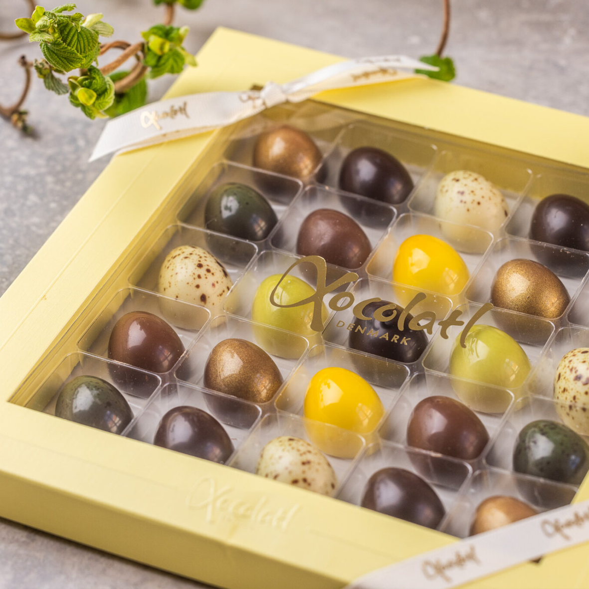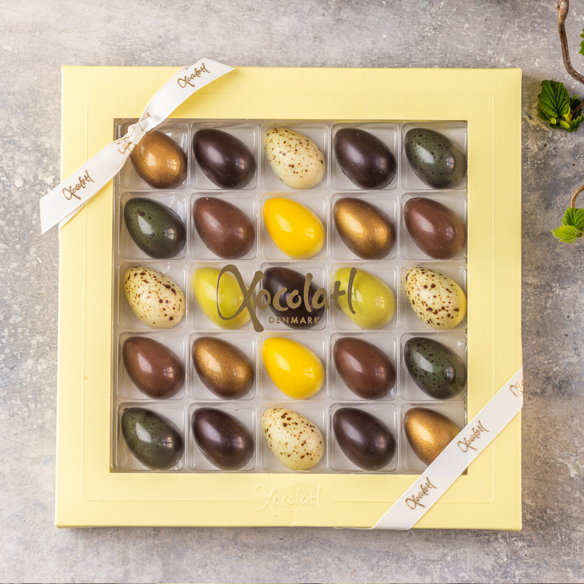 Forkæl sanserne med denne eksklusive æske fra Xocolatl med 25 smukke påskeæg. Hvert æg byder på en perfekt balance mellem en sprød chokoladeskal og en cremet, smagfuld fyldning.
