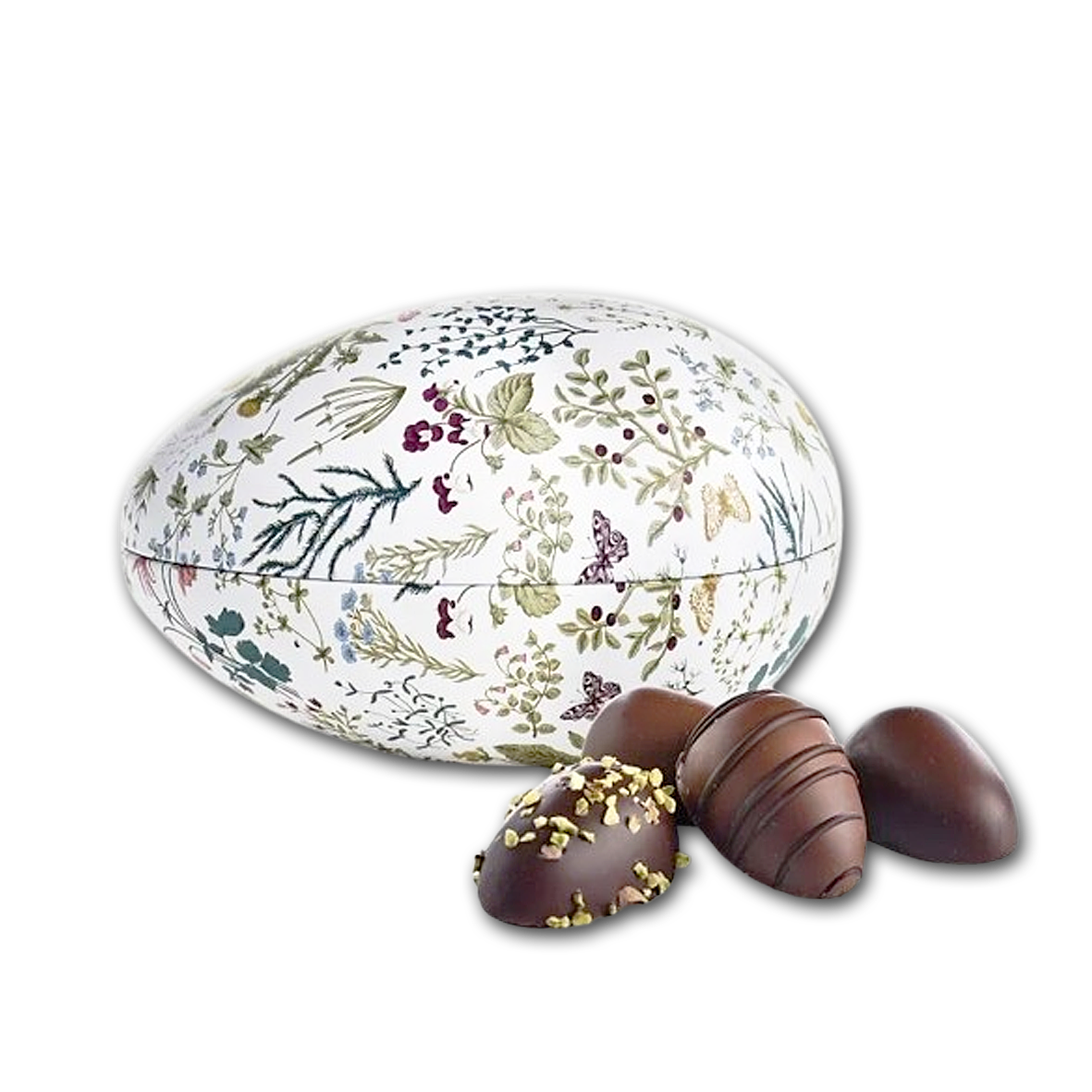 Metal påskeæg med blomstermotiv fyldt med de lækreste store marcipanæg