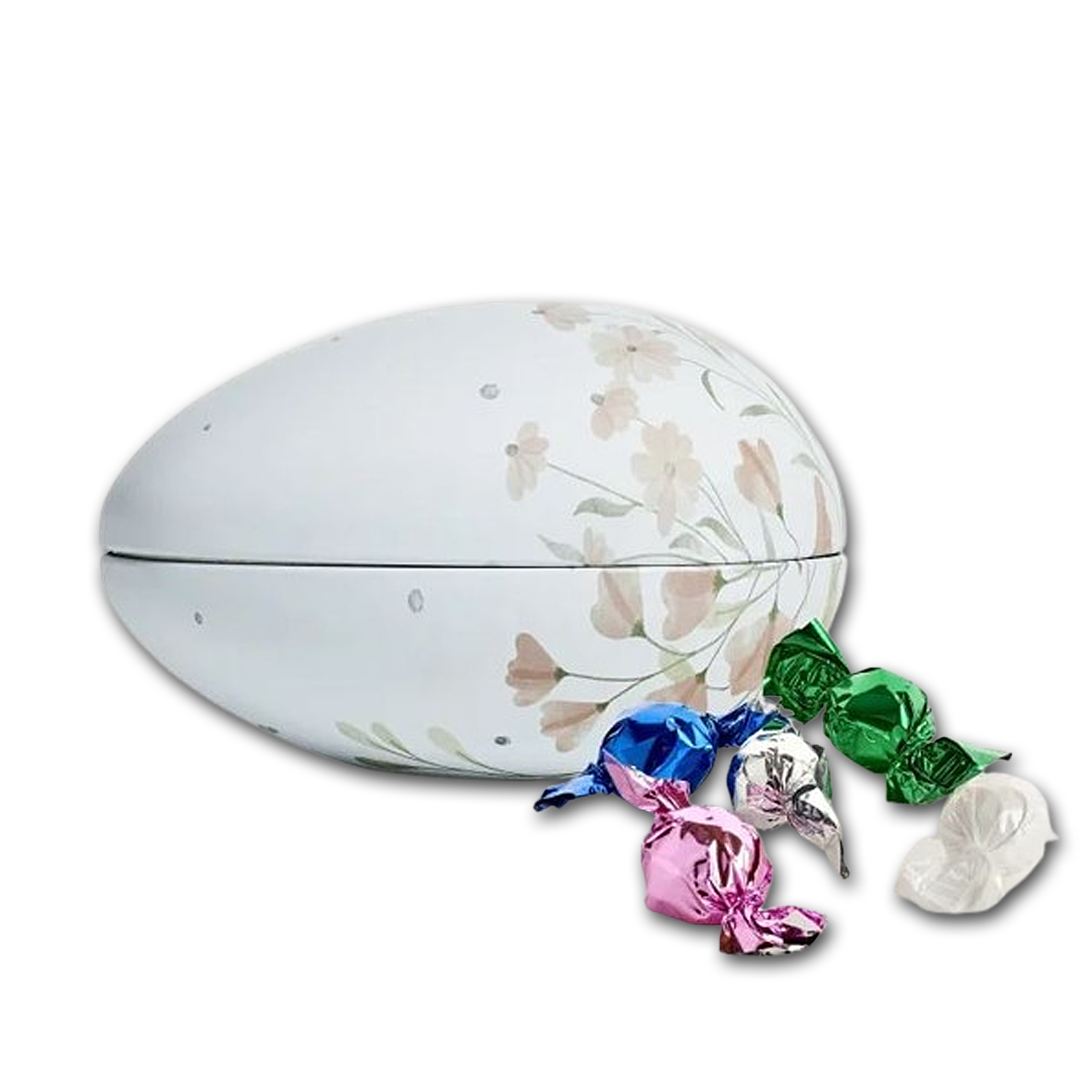 Et smukt metalæg med motiv af skønne blomster, fyldt med de lækreste blandede chokoballs. Brug det som en del af din påskepynt, eller overrask en du holder af med en smagfuld og dekorativ gave.