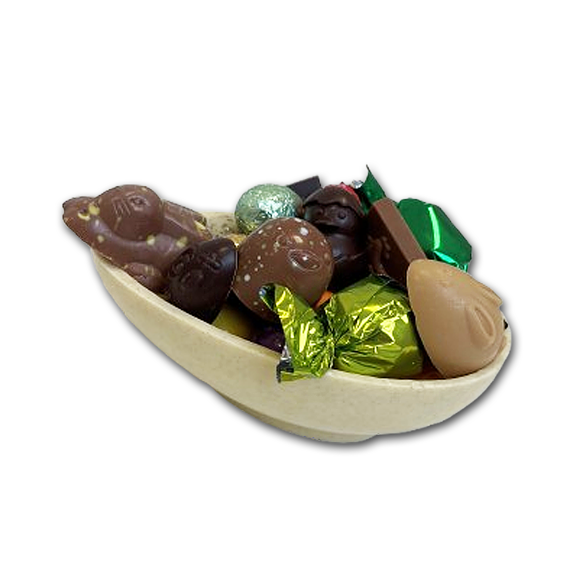 Vores smukke påskeskal er håndlavet i Thy, fremstillet i cremet hvid chokolade med fine noter af lakrids, som giver en perfekt balance mellem sødme og karakter. Kombinationen af hvid chokolade og lakrids er lige noget for lakridselskere og så er den fyldt med lækker slik og vores håndlavede fyldte chokolader, lavet i eget chokoladeværksted.