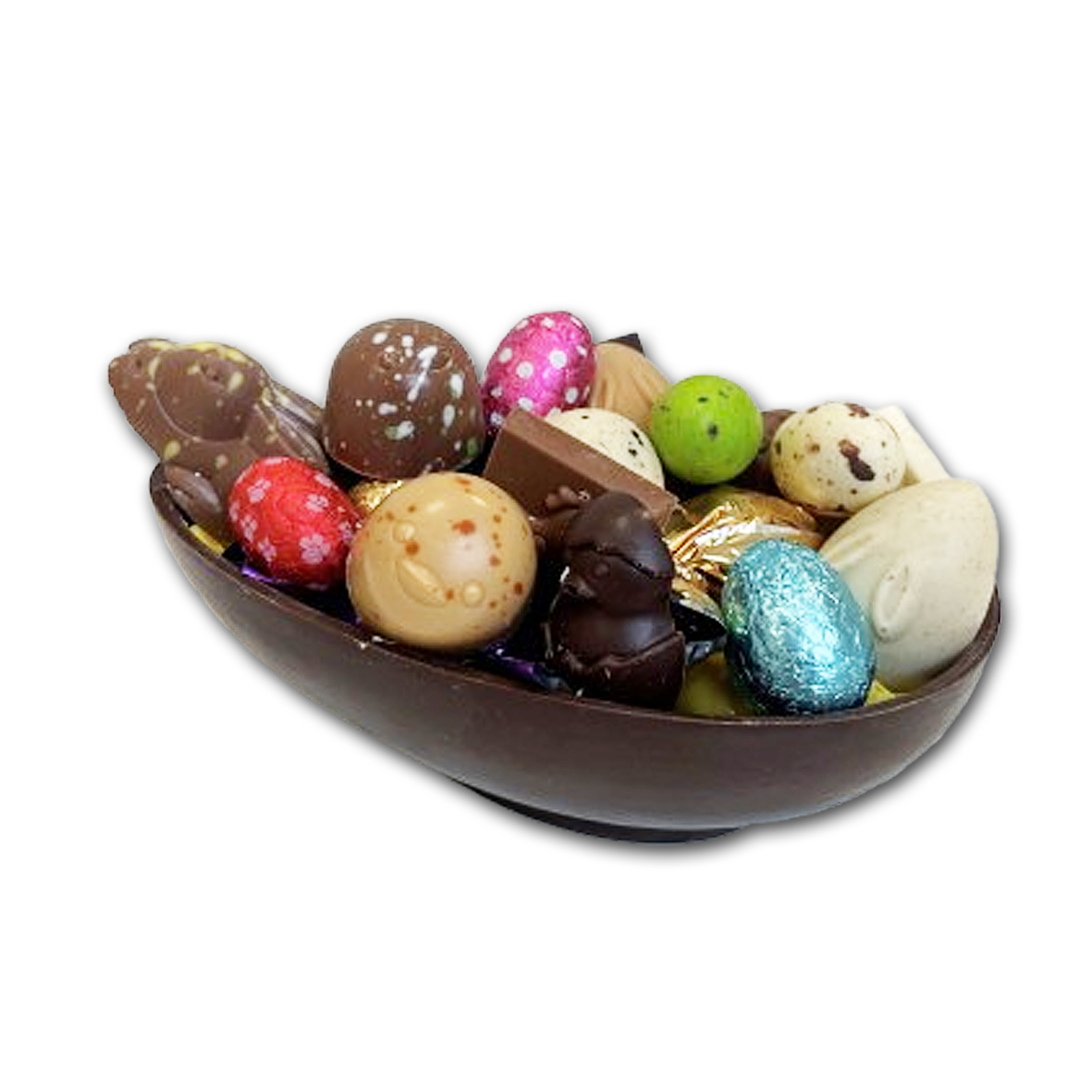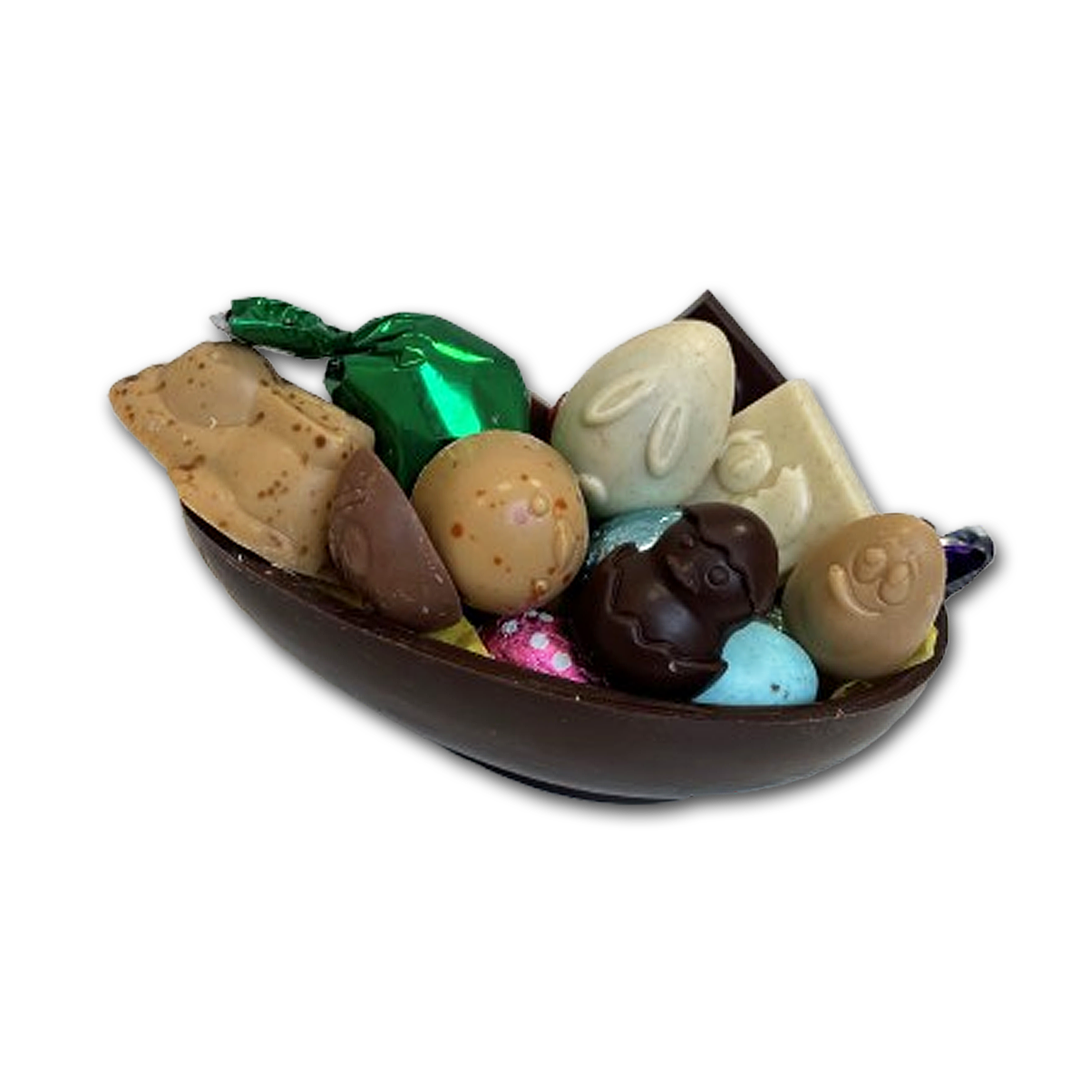 Denne eksklusive påskeskal er håndlavet i Thy med fokus på kvalitet, detaljer og smag. Den er fremstillet af intens mørk chokolade med en fin og naturlig appelsinsmag, som giver en harmonisk balance mellem dyb kakao og frisk citrus. Den er fyldt med en lækker blanding af udvalgt slik og vores håndlavede fyldte chokolader, lavet i eget chokoladeværksted.