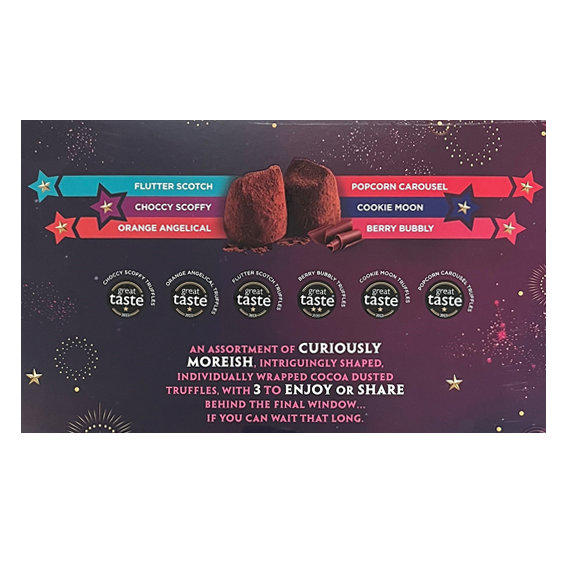 Forkæl dig selv eller en heldig chokoladeelsker med denne luksuriøse julekalender fra Monty Bojangles. Bag hver låge gemmer der sig en forførende fransk trøffel med et strejf af kakaopulver – en silkeblød, cremet oplevelse med et strejf af dekadence.