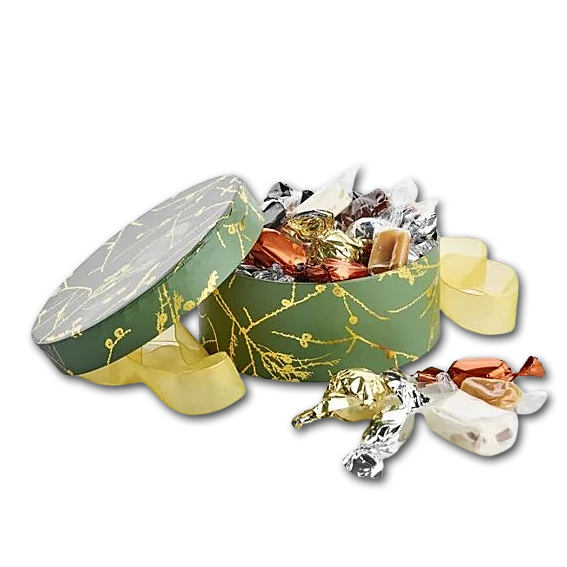 Juleæske fyldt med lækre chokoballs, karameller og fransk nougat. En flot æske fyldt med lækkerier til julens slikskål