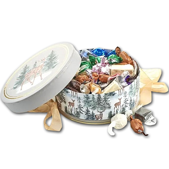 Stor og flot juleæske fyldt med lækre chokoballs, karameller og fransk nougat. En flot æske fyldt med lækkerier til julens slikskål